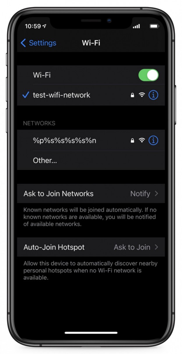 Баг iOS нарушает работу Wi-Fi в iPhone из-за пары простых символовВ iOS был обнаружен новый баг, нарушающий работу беспроводной сети Wi-Fi в iPhone. При подключении смартфона к точке доступа, название сети которой имеет особую комбинацию символов, происходит сбой, из-за которого функция Wi-Fi полностью перестаёт работать. При этом не помогает ни переименование точки доступа, ни перезагрузка смартфона. Обнаружился баг случайно, когда исследователь попытался подключить iPhone XS с iOS 14.4.2 на борту к своей домашней сети с именем «%p%s%s%s%s%n». Сообщается, что баг проявляется и на актуальной iOS 14.6. При этом Android-устройства подобной ошибке не подвержены.