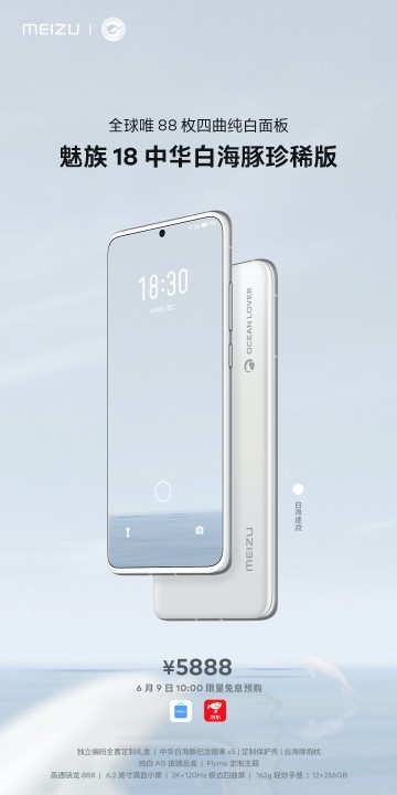 Белый дельфин: выпущена партия из 88 уникальных Meizu 18 (цена)Смартфоны компании Meizu долгое время выделялись среди конкурентов одной маленькой деталью: белой передней рамкой вокруг экрана. «Традиция» оказалась прервана в этом году, ведь представленные в марте Meizu 18 и Meizu 18 Pro получили стандартную чёрную окантовку дисплея. И вот, спустя три месяца производитель решил порадовать фанатов выпуском ограниченной партии базовой модели Meizu 18 с белой рамкой вокруг 6,2" экрана. Посвящена она находящемуся на грани исчезновения виду китайских речных дельфинов белого цвета.