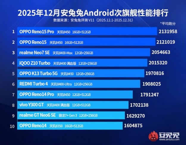 Як і в листопадовому рейтингу, значну частку топу смартфонів верхнього середнього цінового сегмента зайняли пристрої на процесорах MediaTek. Перше і друге місця дісталися моделям Oppo Reno15 Pro (2 131 958) і Reno15 (2 121 019) — обидва на чіпі Dimensity 8450. Третім став Realme Neo7 SE (Dimensity 8400-Max, 2 054 663), четвертим — iQOO Z10 Turbo (Dimensity 8400, 2 015 320), п'ятим — Oppo K13 Turbo (Dimensity 8450, 1 970 816). Далі йдуть Redmi Turbo 4 (Dimensity 8400-Ultra, 1 908 025), Oppo Reno14 Pro (Dimensity 8450, 1 791 247), Vivo Y300 GT (Dimensity 8400, 1 702 138), Realme GT Neo6 SE (Qualcomm Snapdragon 7 Gen 3, 1 629 270) і Oppo Reno14 (Dimensity 8350, 1 604 875).
