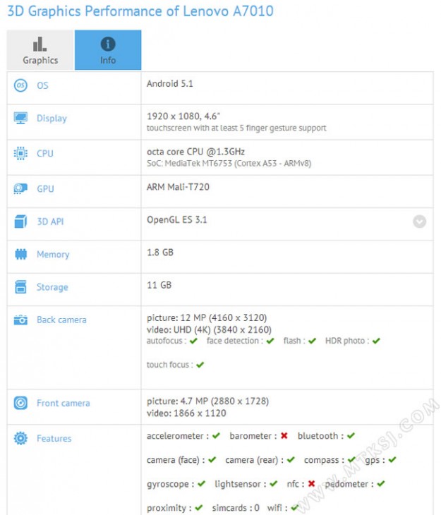 Бенчмарк GFXBench "рассекретил" смартфон Lenovo A7010В базе данных бенчмарка GFXBench засветился не представленный еще официально смартфон китайской компании Lenovo с номером модели A7010. По данным тестера, аппарат оснащен дисплеем с разрешением 1920х1080 пикселей, 8-ядерный процессор MediaTek MT6753 с тактовой частотой 1.3 ГГц и графикой Mali-T720, 2 ГБ оперативной памяти и 16 ГБ встроенной.