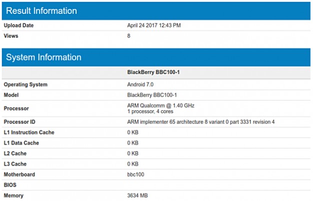 BlackBerry BBC100-1 с 4 ГБ ОЗУ и Android 7.0 засветился в GeekbenchКомпания BlackBerry готовит к анонсу новый смартфон с модельным номером BBC100-1. По крайне мере, на это намекают данные бенчмарка Geekbench, где успела уже засветиться будущая новинка.