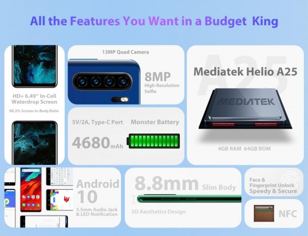 Характеристики Согласно целевой странице Blackview A80 Plus, водяной дисплей Blackview A80 Plus имеет размер 6,49 дюйма с технологией In-Cell, у него соотношение экрана к корпусу составляет 90,3%. Одной из изюминок телефона является его 13-мегапиксельная основная камера с четырьмя мегапикселями, что делает его на одном уровне с современными флагманскими аналогами. Аккумулятор имеет внушительную емкость в 4680 мАч, при толщине телефона 8,8 мм и весе 180 г. Это меньше, чем другие смартфоны Blackview, которые предлагает производитель. Модель A80 Plus работает на базе 12-нм чипсета Mediatek Helio A25, операционной системы Android 10, 4 ГБ оперативной памяти и 64 ГБ встроенной памяти. В телефоне два слота для SIM-карт, а также отдельный слот для карт памяти microSD. Также не забыли разъем для наушников 3,5 мм и поддержку NFC.
