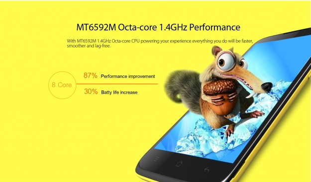 Аппарат оснащен 5-дюймовым IPS-дисплеем с разрешением 1280x720 пикселей, 8-ядерным процессором MediaTek MT6592M с частотой 1.4 ГГц и графикой Mali-450, 1 ГБ оперативной памяти и 8 ГБ встроенной, которую можно расширить с помощью microSD-карт максимальным объемом до 32 ГБ.