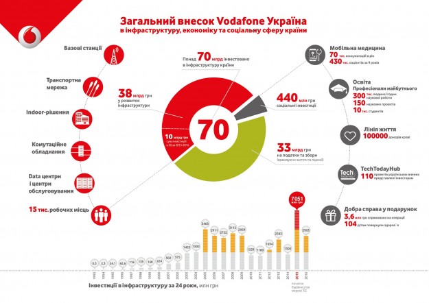 Более 70 миллиардов грн инвестировал Vodafone Украина в украинскую экономикуВ 2016 г Vodafone Украина инвестировал в телекоммуникационную инфраструктуру 2,9 млрд грн. Общие инвестиции компании в период активного строительства сети в 2015-2016 гг достигли рекордного на рынке показателя в 10 млрд грн. В 2016 г Vodafone Украина инвестировал в телекоммуникационную инфраструктуру 2,9 млрд грн. Общие инвестиции компании в период активного строительства сети в 2015-2016 гг достигли рекордного на рынке показателя в 10 млрд грн.