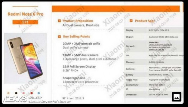 Больше подробностей по Xiaomi Redmi Note 6 ProСегодня в Сети появилась фотография неанонсированного Xiaomi Redmi Note 6 Pro, которая показала четыре камеры, емкий аккумулятор и большой дисплей. Вскоре после этого SlashLeaks поделился еще одной утечкой, которая конкретизирует полученные характеристики и добавляет к ним новые детали. Самое важное – Redmi Note 6 Pro получит тот же чипсет, что и его предшественник – Snapdragon 636. Покупателю будут предложены издания 3/32 и 4/64 ГБ в черном, золотом, розовом, красном и синем цветах. Габариты – 157,9 х 76,* х 8,2 мм. Примечательно, что новинка будет оснащаться старым добрым microUSB 2.0. Ну а главной особенностью станет 20+2-Мп фронталка со светодиодной вспышкой. Когда состоится премьера, все еще неясно.