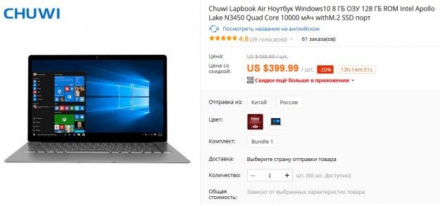 Вот несколько самых интересных устройств: Chuwi LapBook Air - $399.99, 20% скидки Он получил 14,1-дюймовый экран с HD IPS матрицей и оснащен чипсетом Intel Apollo Lake N3450 и поддерживается 8 ГБ оперативной памяти, а также 128 ГБ встроенной памяти. Все это вместе обеспечивает безупречную производительность. Если вы ищете альтернативу MacBook, но не хотите переплачивать, это будет действительно хороший выбор, в добавок к которому вы получите красивый дизайн в тонком корпусе. SurBook Mini - $269, скидка 20% ( также можно использовать купоны ) Это 10,8-дюймовый Windows 2-в-1 планшет с разрешением 1920х1280, оснащен чипсетом Intel Apollo Lake N3450 и имеет 4 ГБ оперативной памяти и 64 ГБ встроенной. Это преемник предыдущего SurBook, чемпиона по сборам на один миллион долларов в Indiegogo. Chuwi Hi10 Plus - $169.99, скидка 20% Это 10,8-дюймовый планшет с двумя ОС, экраном высокой четкости и чипсетом Intel Cherry Trail X5 Z8350. Внутри 4 ГБ оперативной памяти и 64 ГБ встроенной памяти. Он может быть превращен в ноутбук путем подсоединения клавиатуры. Корпус ультратонкий и удобный для ношения с собой. Chuwi Hi10 Pro - $169.99, скидка 20% У этой модели много чего схоже с Hi10 plus, но экран меньше - 10,1 дюйма. Джерело: SmartPhone.ua Обговорення новиниКоментариев пока никто не оставил. Станьте первым! Попередні новини