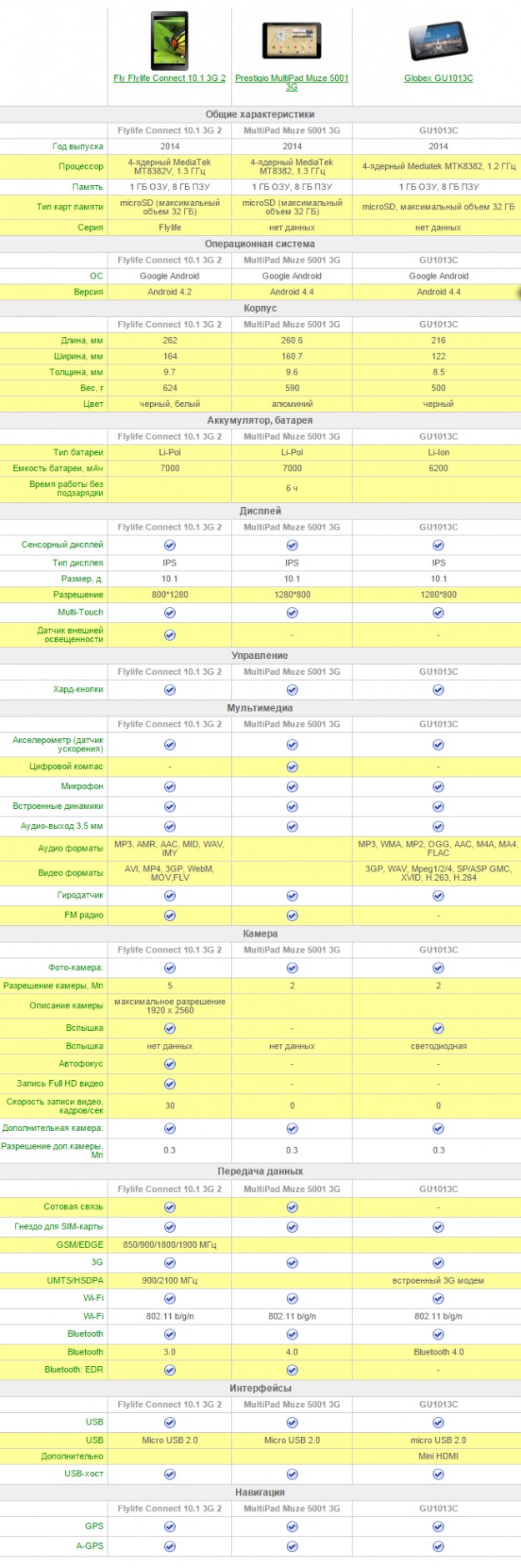 Большой планшет – большие возможности. Prestigio MultiPad MUZE 5001 3G: КонкурентыСамыми близкими конкурентами Prestigio MultiPad Muze 5001 3G по ценовому диапазону и характеристикам можно назвать две модели: Fly Flylife Connect 10.1 3G 2 и Globex GU1013C. Все трое построены на одной платформе от MediaTek и получили одинаковый объем оперативной и встроенной памяти. Цены на соразмерные по дисплею устройства от компании Samsung начинаются с 6500 грн, а от компании ASUS - c 6700 грн, Sony - с 12000 грн. Так что их, как и продукцию Apple, в расчет не берем. Разберемся, в чем же тестируемый планшет превосходит конкурентов. Во-первых, у модели от Fly он выигрывает в цене (ориентировочно на 100 грн дешевле) и весе (на 30 грамм легче). Во-вторых, у Prestigio более новая версия предустановленной ОС Android, а также Bluetooth 4.0 против 3.0. Есть преимущества и у Fly - 5 Мп основная камера. Однако, она, как и 2Мп фотомодуль обозреваемого устройства, может снимать Full HD видео. У малоизвестного Globex GU1013C ценник на 200 грн меньше, аккумулятор всего 6200 мАч против 7000 мАч у Prestigio, а также нет телефонной функции, хотя работать с SIM-картой планшет умеет и может получать 3G-интернет. Единственным его бонусом является встроенный mini HDMI порт, которого у двух остальных нет. Полная сравнительная таблица характеристик трех планшетов приведена ниже: