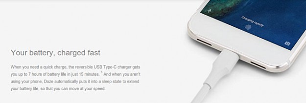 На нижнем торце Google Pixel и Pixel XL будет обустроен симметричный порт USB Type-C с поддержкой технологии быстрой зарядки. По словам производителя, 15 минут подзарядки хватит на 7 часов дополнительной автономной работы смартфона.