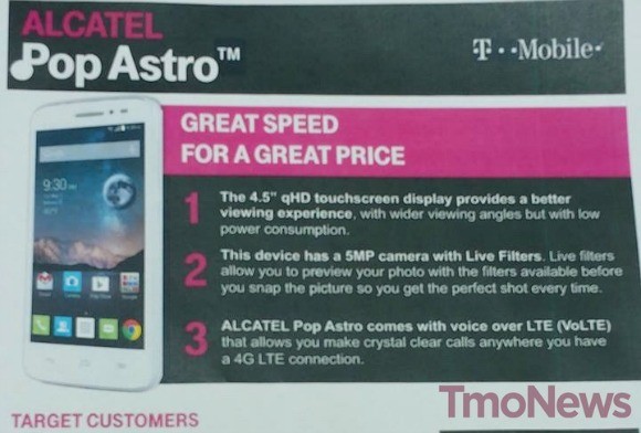 Бюджетный ALCATEL Pop Astro "засветился" в рекламной брошюре T-MobileВ Сети опубликовали фото рекламной брошюры не представленного еще официально смартфона ALCATEL Pop Astro, которая рассекретила и дизайн, и большинство технических характеристик будущей новинки. Итак, аппарат предназначен для работы в сетях крупнейшего американского сотового оператора T-Mobile и представляет собой устройство среднего ценового сегмента. Он оснащен 4.5-дюймовым дисплеем с разрешением 540x960 пикселей, 4-ядерным процессором с частотой 1.2 ГГц, 1 ГБ оперативной памяти и 4 ГБ встроенной.