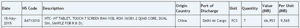 Фрагмент документа информирует о том, что семь тестовых экземпляров устройства прибыли из Китая в Индию на тестирование 15 мая 2015 года. Стоимость одного планшета составляет порядка $150.