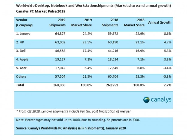 По оценкам Canalys, в прошлом году в глобальном масштабе было поставлено 268,1 млн настольных ПК, ноутбуков и рабочих станций. Это на 2,7 % больше результата 2018-го, когда отгрузки равнялись 261,0 млн единиц.