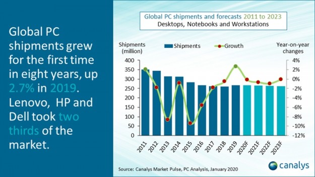 Компания Canalys прогнозирует, что после роста продаж в 2019-м мировой рынок персональных компьютеров в ближайшие годы будет демонстрировать отрицательную динамику.