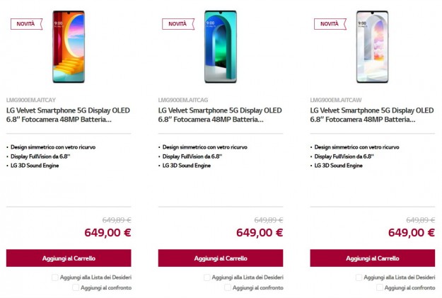 Цена LG Velvet в ЕвропеLG объявила о том, что ее новый смартфон, главный акцент в котором сделан на дизайн и исполнение деталей, будет доступен и в Европе тоже. И вот сегодня новинка доступна для заказа, в частности, в Италии. Стала известна и цена, которую корейцы попросят за этот гаджет - 649 евро. Напомним, за эти деньги покупатель получит внушительный 6,8'' pOLED-дисплей с разрешением Full HD+, чипсет Snapdragon 765G (с 5G, конечно, куда же без него), 6/128 ГБ памяти, тройную основную камеру, стилизованную под капельки, аккумулятор на 4300 мАч с быстрой и беспроводной зарядкой, защищенный по стардартам IP68 корпус из стекла и Android 10. Итальянская LG обещает до 400 евро выгоды при покупке, в том числе бесплатный чехол и наушники.