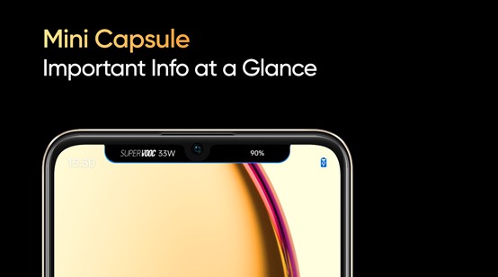 Зверху realme C53 вбудований 6,74-дюймовий екран з частотою оновлення 90 Гц і максимальною яскравістю 450 ніт, а також міні-виріз на верхньому краю, що забезпечує більш комфортний перегляд. І realme на цей раз реалізувала перший в Android Mini Capsule на C53, який розумно адаптується до дисплея та огортає міні-виріз фронтальної камери для відображення сповіщень. Він може відображати різні кольори своєї динамічної підсвічуваності в трьох станах батареї - Повністю заряджена, Зарядка і Низький заряд у зеленому, синьому та червоному відповідно. Крім того, користувачі зможуть отримати додаткові функції використання даних та статистики кроків через оновлення через повітря. Щодо подальшого розгортання, realme підтвердила, що Mini Capsule буде доступний для всіх продуктів серії C в цьому році.