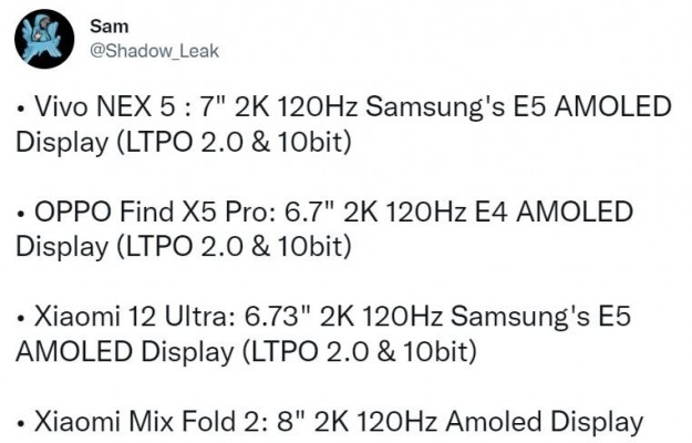 У Vivo экран 2К получит топовая модель Nex 5. Ожидается, что это будет панель AMOLED производства Samsung последнего поколения E5 с диагональю 7 дюймов и кадровой частотой 120 Гц. Oppo ответит на это своим флагманом – «родным братом» OnePlus 10 Pro под названием Oppo Find X5 Pro. Этой модели приписана панель Samsung AMOLED E4 с диагональю 6,7 дюйма с кадровой частотой те же 120 Гц.