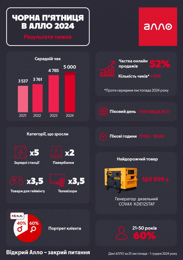 Середній чек зріс на 35% та становив 5 тис. грн Середній чек акційного періоду Чорної п'ятниці зріс на 35% проти середини листопада та на 33% якщо порівнювати 29.11-1.12 до вихідних 14-16 листопада 2024 року. І хоча його сума залишилася на рівні минулого року – близько 5 тисяч гривень, кількість чеків зросла на 70% проти середини листопада та на 25% проти Чорної п'ятниці 2023 року. Обсяги продажів збільшилися в усіх товарних категоріях, але найбільше зростання продемонстрували зарядні станції – у понад 5 разів порівняно з серединою листопада. Також у понад тричі зросли продажі павербанків, товарів для геймінгу та телевізорів. Найдорожчим акційним товаром, який придбали в Алло за цей час, став дизельний генератор COVAX KDE12STAF за 169 999 гривень, на другому місці за вартістю – ноутбук Lenovo Legion Pro 7 16IRX9H за 160 999 гривень. Цього року споживацькі пріоритети схожі на Чорну п'ятницю 2022 року: збільшився попит на товари, які допоможуть пережити блекаут, як-то зарядні станції, павербанки, генератори.