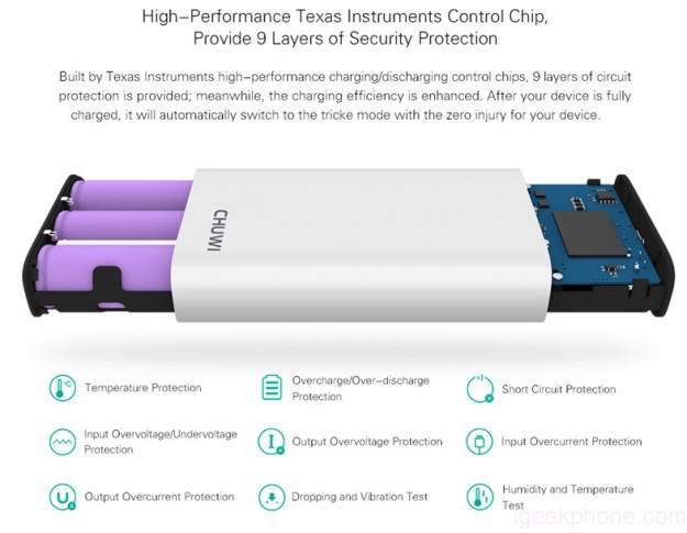 В Chuwi Hi-Power 10050 мАч используются авторитетные аккумуляторы высокой плотности от LG/Panasonic с заниженной ёмкостью и высокопроизводительный контроллер заряда/разряда от Texas Instruments, обеспечивающий 9 уровней защиты.