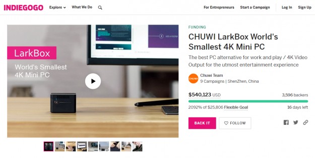 Chuwi LarkBox собрал более полминиона долларов от более чем 3500 человекКомпания Chuwi в июне запустила на Indiegogo «самый маленький компьютер в мире» под названием Chuwi Larkbox. Эта коробочка стоимостью всего $155 оказалась чрезвычайно популярной и уже успела собрать свыше 540 тысяч долларов от более чем 3500 человек.