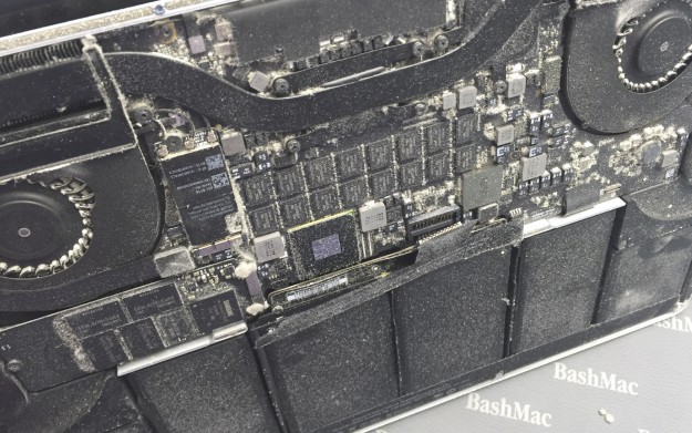 Конечно же, вместе с чистым воздухом, внутрь втягивается различная пыль и мелкий мусор. Эта пыль оседает толстым слоем на лопастях кулера и на всех внутренних деталях. В результате, — теряется теплоотдача, иными словами — MacBook начинает греться. Вентилятор вращается все быстрее, что приводит к шуму, гулу, даже вибрации устройства. Кроме того — пыль является хорошим проводником тока, может способствовать короткому замыканию. Если подытожить, то перегрев ноутбука ведет к его зависанию, износу деталей, самопроизвольному выключению и даже сгоранию элементов системы.