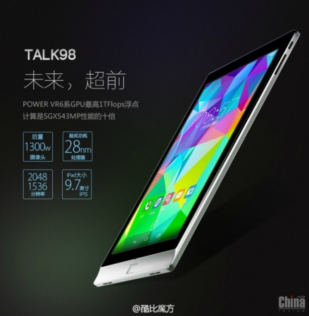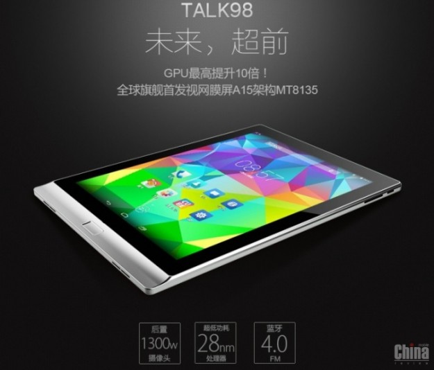 Новинка получила от производителя 9.7-дюймовый дисплей с разрешением 2048х1536 пикселей и 4-ядерный процессор MediaTek МТ8135, выполненный на архитектуре big.LITTLE. В его основе лежит два производительных ядра ARM Cortex-A15 с частотой 1.7 ГГц и два энергосберегающих Cortex-A7 с частотой 1.2 ГГц, а также графический процессор GPU PowerVR G6200.