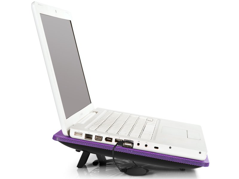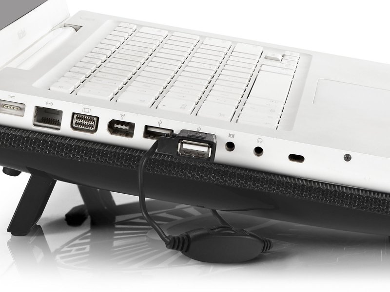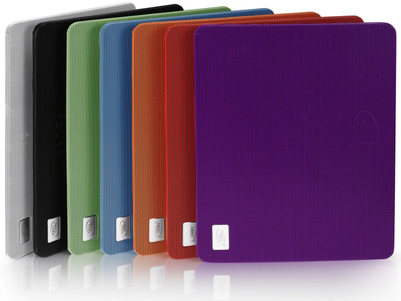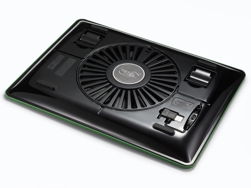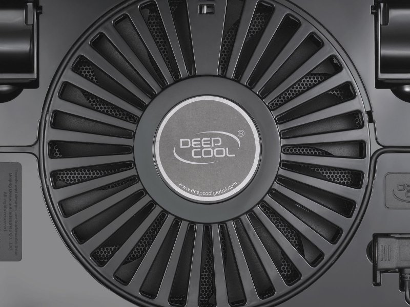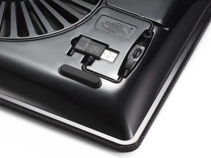 Deepcool N1 - портативная система охлаждения для ноутбуковУстройство легко помещается в стандартную сумку для лэптопов, поскольку в сложенном состоянии его толщина составляет всего 2,6 см. А благодаря небольшому весу, N1 отлично подходит для использования во время поездок. Верхняя и боковая поверхности верхней части корпуса устройства закрыты стильной металлической сеткой. Внешний вид подставки интересен не только сочетанием металла и пластика, но и впечатляющей эстетикой своего элегантного дизайна. Под сеткой расположен большой вентилятор охлаждения диаметром 180 мм, обеспечивающий оптимальный обдув ноутбука, скорость вращения которого изменяется с помощью расположенного на кабеле регулятора.