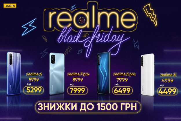 Компания уже обзавелась огромным количеством поклонников, а сейчас их станет намного больше — Black Friday на модели смартфонов realme 6, realme 6 Pro, realme 6i и realme 7 Pro стартует раньше, чем у других компаний и продлится с 20 ноября по 6 декабря включительно! Купить телефон в сегменте до 8000 грн со скидками более, чем в 1500 грн и ощутить на себе, что такое по-настоящему комфортный мобильный гейминг, длительная работа неубиваемых процессоров, новый уровень качества селфи просто невообразимо! От таких предложений не отказываются. Вот что ждет тебя при покупке одного из смартфонов семьи realme: realme 6. Поиграть пару-тройку часов без проседания FPS даже в самых требовательных играх теперь не проблема. realme 6 позиционирует себя как геймерский смартфон и стал первой моделью в линейке бренда, получившей мощный процессор Mediatek G90T, а также экран Full HD+ с частотой до 90 Гц. А это возможность не только комфортно играть, но и стримить сам процесс игры. Емкости аккумулятор в 4300 мАч хватит даже на самый затяжной батл, а зарядится он всего за 1 час. Есть в смартфоне и продвинутая квадрокамера, которая обеспечивает отличную детализацию, четкость, яркость и широкий диапазон твоим снимкам. Цена – 5299 грн realme 6 Pro. Как не крути, а скоро Новый год и с realme 6 Pro ты будешь готов запечатлеть этот праздник во всех деталях. Телефон с оснащением в 6 камер создан специально для людей, стремящихся покорить просторы инстаграма. Фронталка на 16 Мп и 8 Мп ультра ширик сделает угол обзора больше в 2,5 раза — то что нужно для большой компании. Основная камера состоит из четырех объективов: 64 Мп, ультра широкоугольная 8 Мп с углом обзора 119 градусов, макро-объектив, телевик на 12 и макро на 2 Мп. Девайс оснащен режимами Nightscape 3.0 для качественных ночных снимков с 50-ти секундной экспозицией и магический Ultra Nightscape, позволяющий получить четкие и яркие снимки в условиях экстремальной темноты. Экран защищен Corning Gorilla Glass 5 и устойчив к царапинам. 8-ядерный чипсет Qualcomm Snapdragon 720G и графический процессор Adreno 618 отлично справляются с многозадачностью и сложной игровой графикой. Батарея на 4300 мАч требует подзарядки раз в сутки в течение часа. Цена – 6499 грн realme 6i — марафонец среди собратьев. Выносливость смартфону обеспечивает аккумулятор емкостью в 5000 мАч, поддерживающий быструю зарядку в 18 ватт. А с помощью функции обратной зарядки может подзарядить наушники или другой телефон. Бюджетник оснащен IPS-дисплеем HD+, восьмиядерным процессором MediaTek, 3/4 ГБ оперативной памяти, основной квадрокамерой на 48 МП. Телефон подойдёт абсолютно каждому человеку, ведь он сочетает в себе производительность достаточную для любых задач, камеру, не отстающую по качеству от флагманских, огромную автономность, а также NFC. Послужит отличным подарком для любимого человека, ребёнка или для ваших родителей. Цена – 4499 грн realme 7 Pro. Главная новинка бренда уходящего 2020 года. Телефон выполнен в строгом и лаконичном дизайне. Основная квадрокамера в виде стильного прямоугольника добавляет новинке респектабельности и состоит из главного модуля 64 Мп, сверхширокоугольного модуля 8 Мп, макро 2 Мп и датчика глубины 2 Мп. Фронтальная камера: 32 Мп. 6,4 дюймовый дисплей Super AMOLED, 2400?1080 пикселей с разрешением 60 Гц защищен Corning Gorilla Glass 3+. В сердце смартфона 8-ядерный чипсет Qualcomm SM7125 Snapdragon 720G. За графическую составляющую отвечает ускоритель Adreno 618. Объем аккумулятор в realme 7 Pro —4500 м