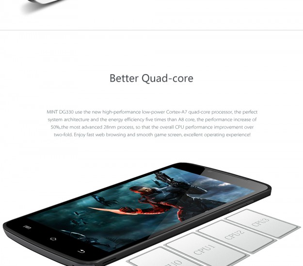 Новинка получила от производителя 5-дюймовый дисплей с разрешением 854x480 пикселей, 4-ядерный процессор MediaTek MT6582 с тактовой частотой 1.3 ГГц, 1 ГБ оперативной памяти и 4 ГБ встроенной, которую можно расширить с помощью microSD-карт максимальным объемом до 32 ГБ.