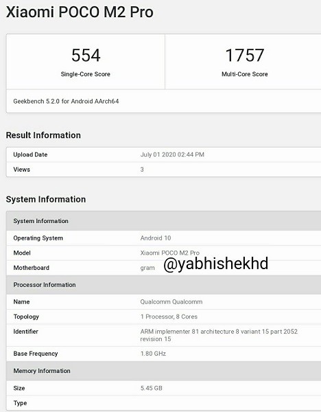 Ранее сегодня сообщалось, что смартфон POCO M2 Pro будет представлен седьмого июля. Теперь, в преддверии запуска, результаты тестирования устройства были обнаружены в базе данных популярного бенчмарка GeekBench. Скриншотом, демонстрирующим результаты тестов, поделился один из пользователей Twitter.