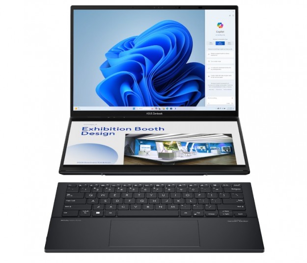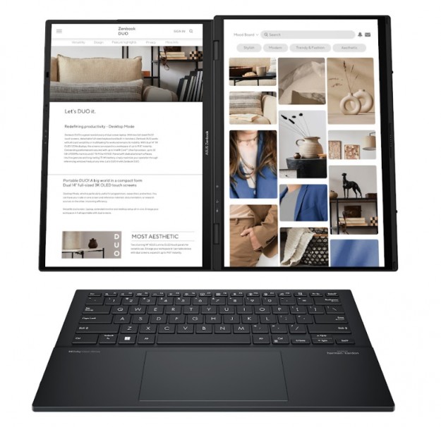 Zenbook DUO є ноутбуком класу Intel Evo™ Edition, майстерно поєднуючи в собі багатозадачні можливості й неперевершену мобільність у легкому корпусі масою лише 1,35 кг. Два повнорозмірні OLED-дисплеї ASUS Lumina OLED із роздільною здатністю до 3K, частотою оновлення 120 Гц і співвідношенням сторін 16:10 з’єднані між собою шарніром із кутом розкриття до 180°. Це дозволяє миттєво розширити робочий простір, перетворивши дисплеї на великий 19,8-дюймовий монітор, який можна використовувати у вертикальній і горизонтальній орієнтаціях у декількох режимах – ноутбук, два екрани, настільний ПК, спільна робота – під керуванням програмного забезпечення ASUS ScreenXpert.