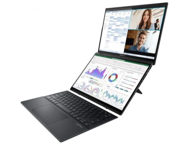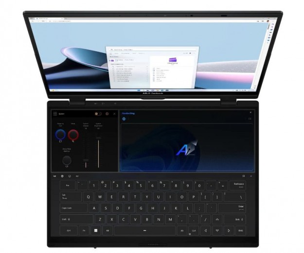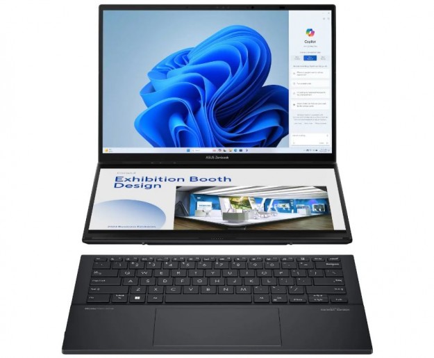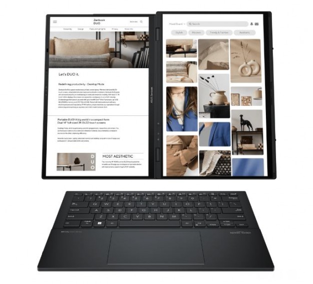 Zenbook DUO є ноутбуком класу Intel Evo™ Edition, який майстерно поєднує в собі багатозадачні можливості й неперевершену мобільність у легкому корпусі масою лише 1,35 кг. Два повнорозмірних OLED-дисплеї ASUS Lumina OLED із роздільною здатністю до 3K, частотою оновлення 120 Гц і співвідношенням сторін 16:10 з’єднані між собою шарніром із кутом розкриття до 180°. Це дозволяє миттєво розширити робочий простір, перетворивши дисплеї на великий 19,8-дюймовий монітор, який можна використовувати у вертикальній і горизонтальній орієнтаціях у декількох режимах – ноутбук, два екрани, настільний ПК, спільна робота – під керуванням програмного забезпечення ASUS ScreenXpert.
