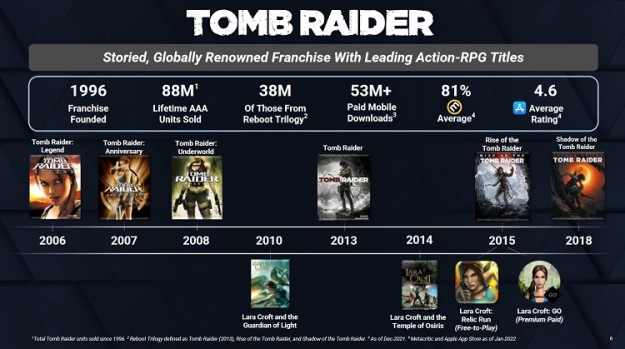 Як стало відомо, обсяг продажів усіх ігор серії Tomb Raider перевищив 88 млн. копій (85 млн. у жовтні 2021 року), 38 млн. з яких припадає на нову трилогію. Ще 53 млн завантажень залучили платні мобільні розваги з франшизи. У Deus Ex показники скромніші: 12 млн проданих копій у сумі у Deus Ex: Human Revolution (зокрема режисерське видання) та Deus Ex: Mankind Divided, а також 2 млн завантажень преміальних мобільних ігор.