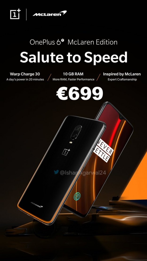 Европейская цена OnePlus 6T McLaren Edition 629 евроУже совсем скоро OnePlus представит специальную версию OnePlus 6T, созданную при содействии автоконцерна McLaren. Благодаря утечкам выяснилось, что это издание будет характеризоваться уникальным дизайном, 10 ГБ оперативной памяти и поддержкой сверхбыстрой (по меркам OnePlus) зарядкой Warp. Накануне презентации стала известна и цена устройства. Согласно этим данным, OnePlus 6T McLaren Edition можно будет купить в Европе за 699 евро. Для сравнения, топовый вариант стандартной версии OnePlus 6T с 8 ГБ ОЗУ и теми же 256 ГБ встроенной памяти обойдется европейскому покупателю в 629 евро. Что еще войдет в эти 70 евро разницы, узнаем уже очень скоро. Следите за нашими новостями.