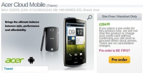 Expansys объявил о начале приема предварительных заказов на смартфон Acer CloudMobileНесмотря на тот скромный факт, что смартфон Acer Cloud Mobile был представлен еще весной на MWC, предварительный заказ на устройство стартовал только на днях, и пока только на рынке Великобритании. Сообщается, что ритейлер Expansys начал принимать заказы от всех желающих, предлагая смартфон с ценовой биркой $447.