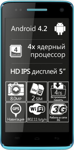 Аппарат получил от производителя 5-дюймовый дисплей с разрешением 720х1280 пикселей, 4-ядерный процессор MediaTek MТK6582M с тактовой частотой 1,3 ГГц, 1 ГБ оперативной памяти и 4 ГБ внутренней, которую можно расширить с помощью microSD-карт максимальным объемом до 32 ГБ. На борту девайса также аккумулятор емкостью 2000 мАч, 2Мп фронтальная камера и 8Мп основная, беспроводные модули Wi-Fi 802.11 b/g/n, Bluetooth 4.0 и GPS, поддержка USB-OTG-сопряжения и функции OTA.