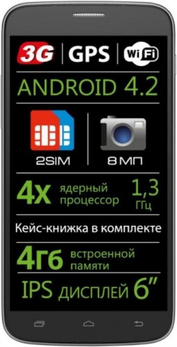 Аппарат, как сообщается на сайте, получил от производителя 6-дюймовый IPS дисплей с разрешением 960x540 пикселей, 4-ядерный процессор с тактовой частотой 1.3 ГГц, 1 ГБ оперативной памяти и 4 ГБ внутренней, которую можно расширить с помощью карт памяти формата microSD максимальным объемом до 32 ГБ.