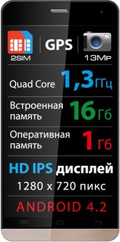 Аппарат получил от производителя 5-дюймовый OGS IPS-дисплей с разрешением 1280х720 пикселей, 4-ядерный процессор MediaTek МТК 6582 с тактовой частотой 1.3 ГГц, 1 ГБ оперативной памяти и 16 ГБ встроенной, аккумулятор емкостью 2000 мАч, 5Мп фронтальную камеру и 13Мп основную с LED-вспышкой, FM-радио, беспроводные модули Wi-Fi 802.11 b/g/n, Bluetooth 4.0 и GPS.