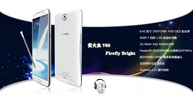 Firefly V65 — новый смартфон с 6.45-дюймовым Full HD дисплеемКитайская компания Firefly представила планшетофон V65 с 6.45-дюймовым дисплеем, разрешение которого составляет 1920x1080 пикселей. Устройство оснащено также четырехъядерным процессором MediaTek 6589T с тактовой частотой 1,5 ГГц, 2 ГБ оперативной памяти и 16 ГБ встроенной, которую можно расширить с помощью карт памяти microSD максимальным объемом до 32 ГБ, 13-мегапиксельной основной камерой и 5-мегапиксельной фронтальной, аккумулятором емкостью 3150 мАч. Кроме этого, в наличии девайса модули Bluetooth 4.0, WiFi 802.11a/b/g/n и GPS.