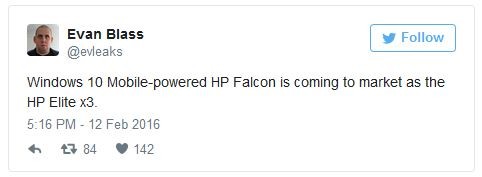 Флагман HP Falcon на Windows 10 получит коммерческое название Elite x3Эван Бласс, известный как twitter-аккаунт @evleaks, поделился новыми подробностями о Windows-смартфоне компании Hewlett-Packard, известном под кодовым названием "Falcon". По словам источника, будущая новинка HP выйдет на рынок под коммерческим именем Elite x3 и будет работать под управлением операционной системы Windows 10 Mobile.