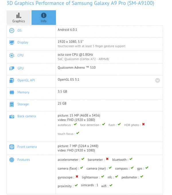 Флагман Samsung Galaxy A9 Pro прошел тестирование в GFXBenchПредстоящий флагман Samsung Galaxy A9 Pro прошел тестирование в бенчмарке GFXBench, показав, что работает на базе 64-битного 8-ядерного процессора серии Snapdragon 652 от Qualcomm c частотой 1.8 ГГц и графикой Adreno 530. Также стало известно, что на борту будущей новинки южнокорейского производителя будет 4 ГБ оперативной памяти и 32 ГБ встроенной, 8Мп фронтальная камера и 13Мп основная с автофокусом и светодиодной вспышкой. Обе с возможностью записи Full HD видео.