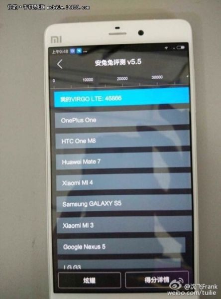 Флагман Xiaomi Mi5 "засветился" на новых фото и в тестере AnTuTuНе представленный еще официально флагман Xiaomi Mi5 стал жертвой утечки фотографий, которые позволяют получить представление об особенностях его дизайна, а также демонстрируют его производительность в бенчмарке AnTuTu. Внешне представленный на фото аппарат оказался во многом схожим с моделью Xiaomi Mi4. Он выполнен в белом цвете, а среди его главных визуальных особенностей можно выделить ультратонкие боковые рамки дисплея. Среди спецификаций новинки источники снимков называют 5.2-дюймовый Full HD-дисплей, 4-ядерный процессор серии Snapdragon 801 от Qualcomm, 13Мп основную камеру с двойной светодиодной вспышкой, а также ОС Android 5.0 Lollipop c фирменной оболочкой MIUI 6 "из коробки". Предполагаемая стоимость Xiaomi Mi5 — $370. Джерело: SmartPhone.ua Обговорення новиниКоментариев пока никто не оставил. Станьте первым! Попередні новини