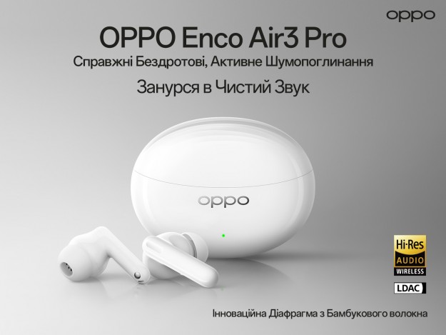 Флагманські навушники з Hi-Fi звучанням OPPO Enco Air3 Pro вже в УкраїніOPPO AED Україна презентує нові бездротові навушники OPPO Enco Air3 Pro, перші у світі навушники з бамбуковою мембраною та адаптивним процесором автоматичного регулювання гучності. Забезпечуючи максимально природне звучання, навушники здатні відтворювати найдрібніші деталі звуку за допомогою високоточної передачі LDAC, що відповідає золотому сертифікату акустичних характеристик Hi-Res Audio. OPPO Enco Air3 Pro також підтримує адаптивне ANC (активне шумозаглушення) з рівнем шумозаглушення до 49 дБ. Завдяки ефектам об'ємного звуку OPPO Alive, Golden Sound 2.0, 30-годинній автономній роботі та багатьом іншим можливостям, цей пристрій пропонує преміальний, першокласний досвід за розумну ціну.