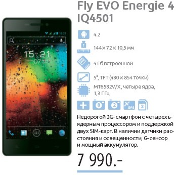 Fly EVO Energie 4, как стало известно, получит от производителя 5-дюймовый TFT дисплей с разрешением 854х480 пикселей, 4-ядерный процессор MediaTek MT6582V/X с тактовой частотой 1,3 ГГц, а также 4 ГБ внутренней памяти, мощный аккумулятор, 2Мп фронтальную камеру и 8Мп основную. Работать смартфон будет под управлением операционной системы Android 4.2. Его стоимость составит порядка $220.