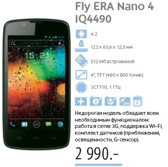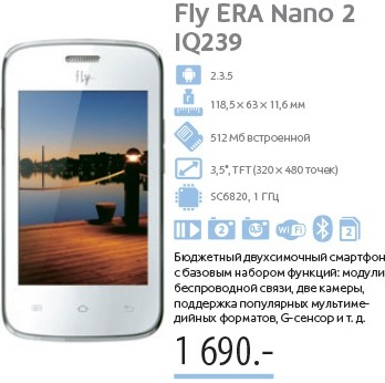 Бюджетный Fly ERA Nano 4 будет оснащен экраном диагональю 4 дюйма с разрешением 800х480 точек, одноядерным процессором Spreadtrum SC7710 с частотой 1 ГГц, 512 МБ ОЗУ, 2Мп основной камерой и VGA фронтальной. Аппарат получит ОС Android 4.2. "из коробки" и ценник в $83.