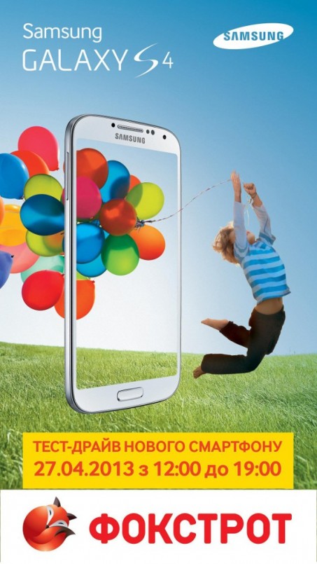 Фокстрот начинает продажи смартфона Samsung Galaxy SIV27 апреля в торговой сети «Фокстрот. Техника для дома» стартуют продажи долгожданной новинки от Samsung - смартфона Galaxy S4. Новая модель будет доступна по цене 6999 гривен. Киев, Харьков и Львов первыми увидят это новое произведение технического искусства от компании Samsung Electronics в действии. 27 апреля с 12:00 до 18:00 будет проходить тест-драйв четвертого поколения флагманской линейки GALAXY S – смартфона GALAXY S 4 в магазинах «Фокстрот» по адресам: Киев, пр. Оболонский, 21 (ТРЦ «Дрим Таун»); Львов, ул. Княгиги Ольги, 106; Харьков, ул. Вернадского, 2. Посетителям этих магазинов будут продемонстрированы характеристики Galaxy S4 в формате мастер-класса: телефон подключат к телевизору, на широком экране которого будет отображаться всё, что происходит на экране телефона.