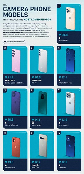 Фотографии, сделанные Samsung Galaxy S23 Ultra, в числе любимых у пользователей FlickrФотохостинг Flickr опубликовал рейтинг камерофонов, который составлялся исходя из количества лайков на одну фотографию. На первом месте – iPhone 13 Pro, и в целом в топ-10 шесть позиций у смартфонов Apple. А лучший из лагеря Android – это Galaxy S23 Ultra, и он на втором месте.