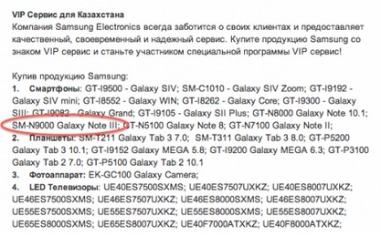 Galaxy Note 3 появился на официальном сайте SamsungSamsung Galaxy Note 3 с номером модели SM-N9000 был замечен на сайте Samsung Electronics, посвященном деятельности компании в Казахстане. Среди других представленных на нем неаносированных новинок также были камерофон Samsung Galaxy S4 Zoom (SM-C1010) и планшет Samsung Galaxy Tab 10.1 3 (SM-N9000).