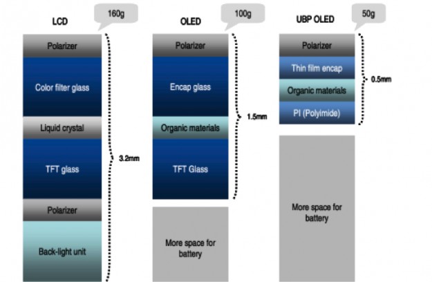 По словам источников, такой дисплей состоит из пластиковой основы, на которой размещается активная управляющая матрица из транзисторов, изготовленных по технологии низкотемпературного поликристаллического кремния, и органические светодиоды трех цветов. Пластиковый дисплей по сравнению со стеклянным, помимо того, что более прочный, намного легче и тоньше.