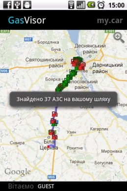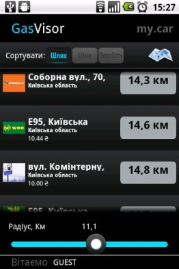 GASVISOR - актуальні ціни на АЗС тепер у вашому Android смартфоніЗапропонована програма дозволяє забезпечити користувача інформацією про актуальні ціни на заправках у визначеному водієм радіусі. При цьому автолюбитель має можливість додатково дізнатись про перелік послуг що надається на кожній автозаправці та прокласти маршрут до обраної АЗС. В аплікації присутня функція сортування по відстані, вартості пального або повній вартості заправки заданого водієм об’єму палива включаючи витрати на доїзд до АЗС.