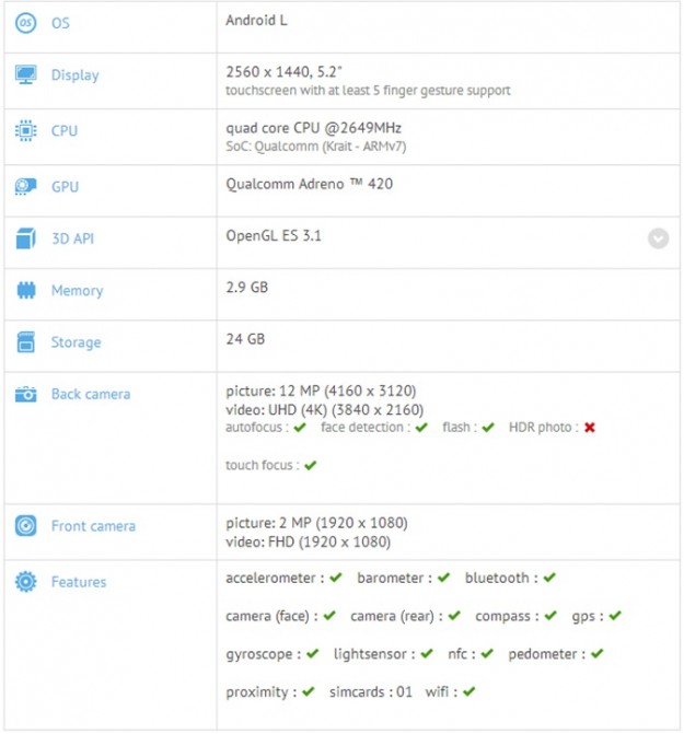 GFXBench "подтвердил" 2K-дисплей, 3 ГБ ОЗУ и Snapdragon 805 для Nexus 6Не представленный еще официально смартфон Nexus 6 с кодовым названием Shamu параллельно с дебютом в бенчмарке AnTuTu был замечен в базе данных не менее популярного тестера GFXBench. Последний подтвердил спецификации новинки, которые ранее стали известны благодаря AnTuTu. Итак, Nexus 6 получит от производителя 5.2-дюймовый дисплей с разрешением 2560х1440 пикселей, 4-ядерный процессор серии Snapdragon 805 от Qualcomm с тактовой частотой 2,65 ГГц и графикой Adreno 420, 3 ГБ оперативной памяти и 32 ГБ встроенной, а также 2Мп фронтальную камеру и 13Мп основную с LED-вспышкой, системой автофокусировки и возможностью записи Full HD видео.