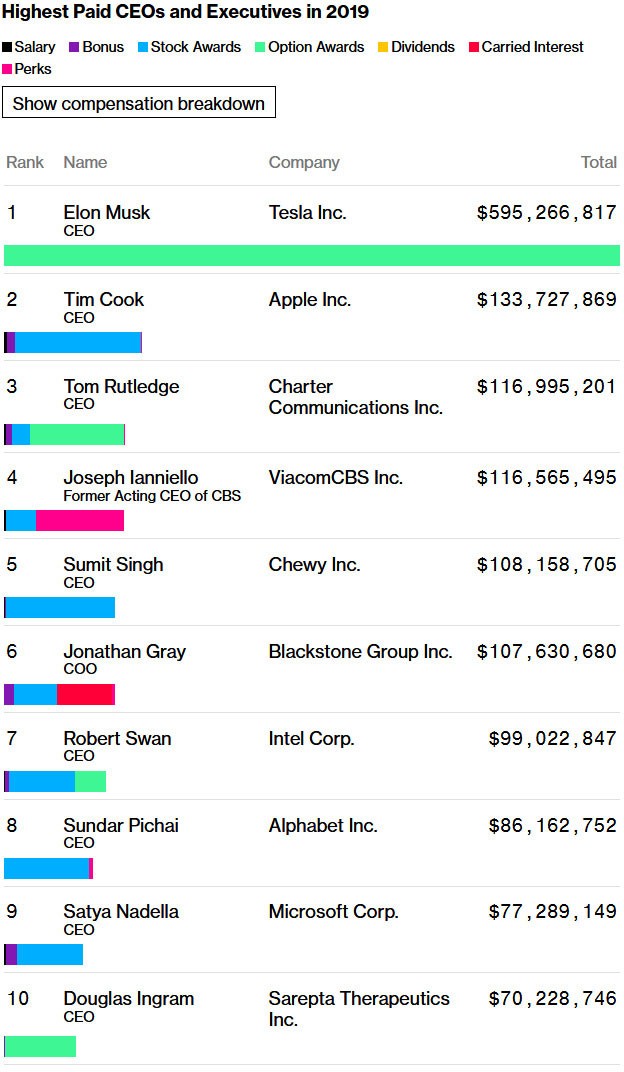 В случае Илона Маска, который возглавил список самых высокооплачиваемых руководителей 2019 года, все деньги, которые он получил, поступили от опционных премий. Глава Microsoft Сатья Наделла тоже получил более $64 млн в виде акций, а более $10,7 млн — в качестве бонуса за результаты компании в 2018 году.